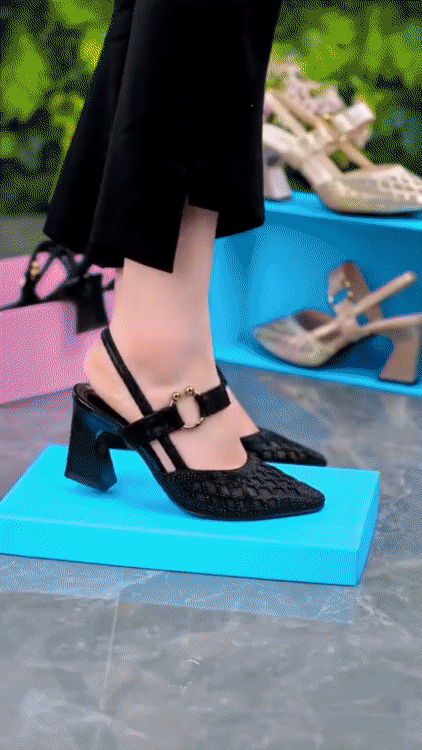 מאפיינים: בוהן מחודדת, עקב נמוך שמנמן, עיצוב רשת, כפתור חצי עגול, סגירת אבזם קרסול מתכווננת לנשים.